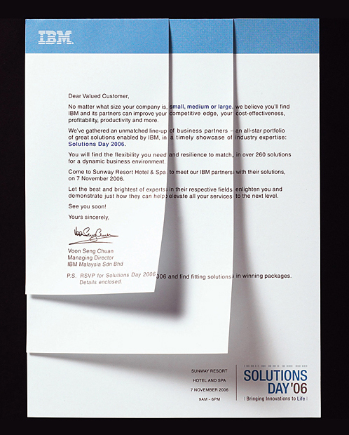 To change the perception that IBM caters only to large corporations, a specially-designed letter split into three parts, analogous to Small, Medium and Large businesses was created. All three parts could be read as one letter. Each part could also be read as a standalone letter, showing that every business regardless of size is important to IBM.